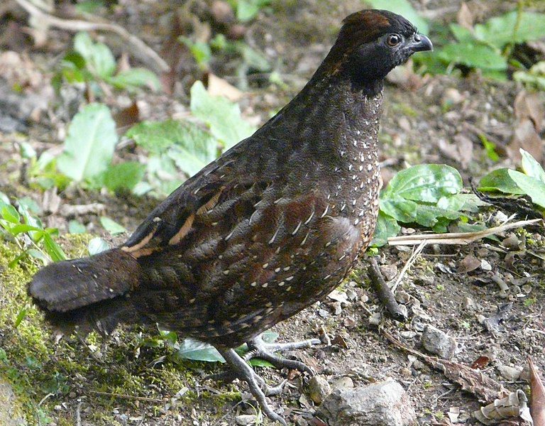 Mide entre 28,5 y 30 cm de longitud y en promedio pesa 305 g. Corona y cresta corta color castaño rojizo (rufo); frente, mejillas, nuca y garganta negras; anillo ocular gris pizarra; dorso castaño con rayas grises, ante y negras y alas color castaño con barras negras y puntos beige. La parte inferior es de color marrón grisáceo con rayas finas de color castaño y gris y con el centro del pecho y el vientre con matices blacuzcos y puntos