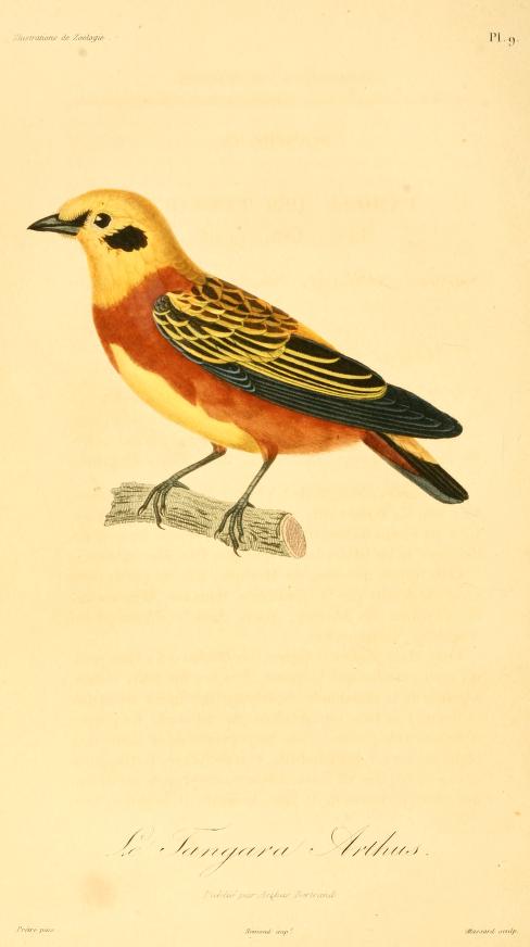 La especie T. arthus fue descrita por primera vez por el ornitólogo francés René-Primevère Lesson en 1832 bajo el mismo nombre científico; su localidad tipo es: Caracas, Venezuela. En promedio mide 13,5 cm de longitud y pesa 22 g. La corona, frente, zona loreal, cuello, pecho y abdomen color amarillo dorado, las alas con franjas negras, rectrices y alrededor del pico y la orejas de color negro. La subespecie T. arthus presenta una banda color castaño cruzando el pecho, vientre y la cara inferior de las alas. La subespecie T. a. aurulenta es color amarillo más claro. Su dieta está conformada por insectos que busca en las ramas de los árboles y frutos, principalmente bayas y melastomáceas.