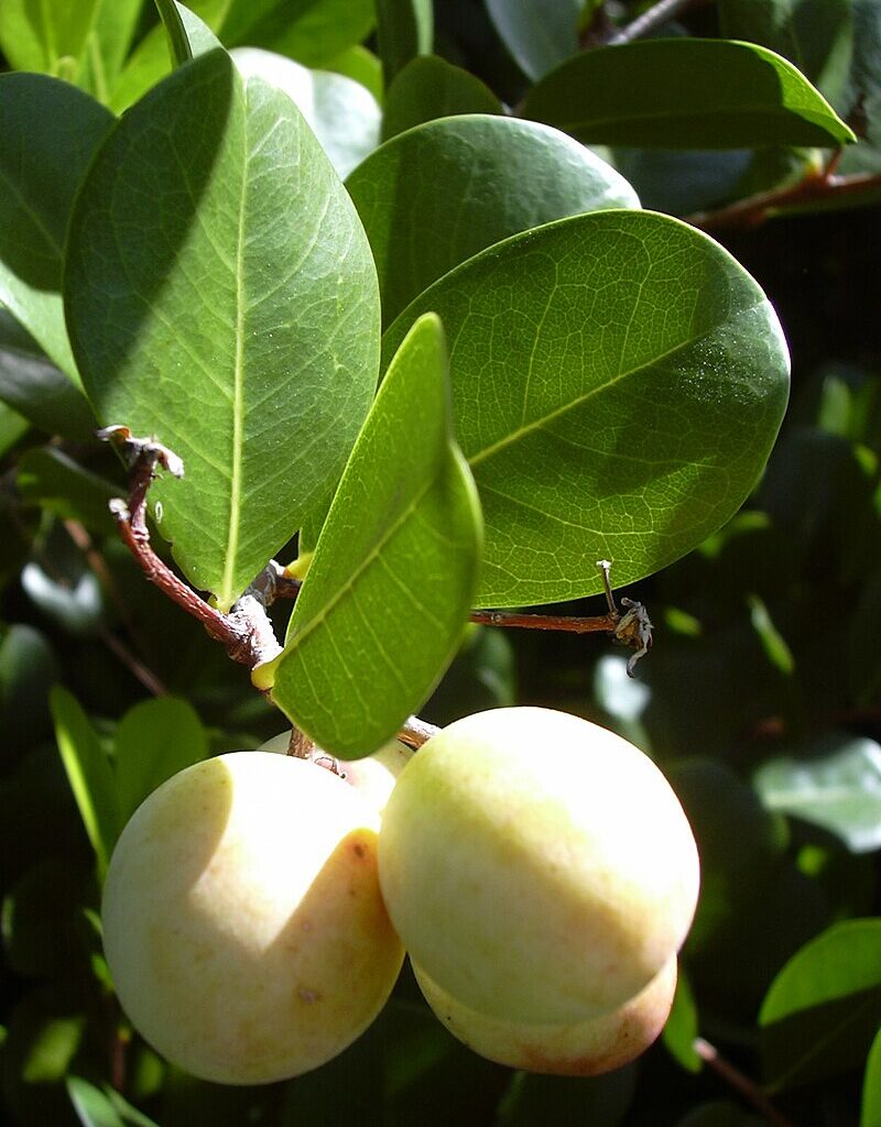 Chrysobalanus icaco es un arbusto de 1 a 3 m de altura, o árbol tupido de 2 a 6 m, que raramente alcanza 10 m. Tiene hojas verdes ovaladas, casi redondas, de textura un poco de cuero (de 3 a 10 cm de largo y de 2,5 a 7 cm de ancho). Los colores de las hojas varían de verde a rojo suave. La corteza es grisácea o marrón rojizo, con pintas blancas.