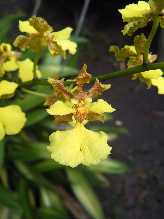 Hierba epífita, pseudobulbos desde angostos hasta ovoides, con 1-2 hojas oblongas de 12-18 cm de largo. Panículas laxas de 1 m de largo con muchas flores. Flores amarillas con manchas rojo-parduscas.