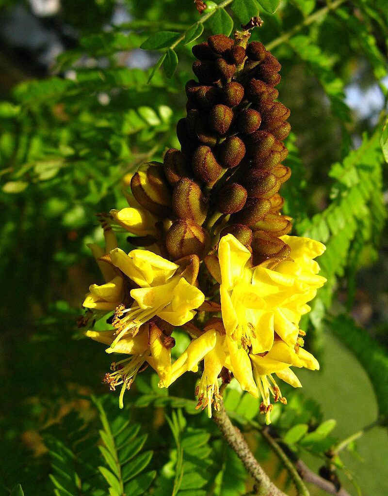 Árbol siempreverde de 5-8(-20) m de altura, con una copa redondeada, densa y amplia, de un color verde muy vistoso, con un tronco más o menos recto o a veces con varios troncos desde la base, con la corteza grisácea o castaño-grisácea, lisa o rugosa cuando es joven, fisurándose y desprendiéndose en largas placas verticales, o en gruesos trozos rectangulares, con el paso de los años. Ramas cilíndricas, lenticeladas, glabrescentes. Hojas alternas, bipinnadas, imparipinnadas, de 7-22 cm de largo, con el raquis de 4-15 cm de longitud, glabro o pubescente y con glándulas rojizas entremezcladas con el indumento, portando de 5 a 11 pares de pinnas, opuestas o subopuestas, cada una de las cuales con 7-12(-14) pares de folíolos generalmente alternos, sésiles, de oblongo-elípticos a subrómbicos, asimétricos, de 4-16 x 2-8 mm, con la base oblicua y truncada, el margen entero, ciliado y a veces revoluto, y el ápice de redondeado a agudo. Son de textura algo coriácea, discoloros, glabros o espaciadamente pubescentes por el haz y más o menos pubescentes por el envés, al menos en la nervadura. Nervio medio excéntrico, oblicuo, prominente por el envés. Pecíolo de 1-4 cm de largo, glabro o pubescente y a veces con algunas glándulas rojizas entremezcladas con el indumento. Estípulas pronto caedizas. Inflorescencias terminales, formadas generalmente por llamativas panículas de racimos erectos, multifloros, con el raquis, los pedicelos y los cálices de tomentulosos a densamente cubiertos de un tomento ferrugíneo. Brácteas ovado-lanceoladas, acuminadas, de 2,5-6 mm de largo, tomentulosas, caedizas. Flores bisexuales, sobre pedicelos articulados de 8-20 mm de largo. Cáliz con 5 lóbulos, el inferior cuculado, de 7-9 mm de largo, los 4 restantes ovados, de 5-7 mm de largo, fimbriados en el margen; corola amarilla, con 5 pétalos heteromórficos, unguiculados, de obovados a elípticos, el estandarte de 8-12 x 7-8 mm, a menudo con una mancha anaranjada. Androceo con 10 estambres con los filamentos de 11-17 mm de largo, barbados hacia la base. Ovario pubescente, pluriovulado, con estilo recto, de 9-14 mm de largo, seríceo; estigma puntiforme, verde. Legumbre coriácea, plana, con dehiscencia explosiva, oblongo-lanceolada o falcada, comprimida, glabra, bivalva, de 8-16 x 2-3,7 cm, con el margen superior engrosado, conteniendo 4-6 semillas ovoides, comprimidas, de color castaño, lisas, de 15-19 x 10-12 mm.