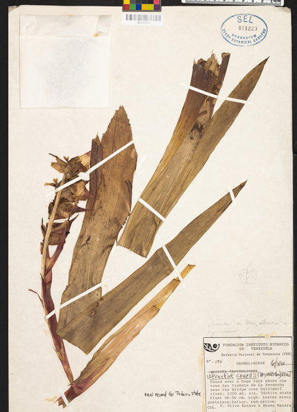 Hierba epífita. Hojas liguladas, de 20-30 cm de largo, sub-glabras. Inflorescencia simple, péndula, densamente cilíndrica, brácteas primarias sub-erectas, anchamente elípticas, rojas en el ápice y verdosas en la base. Brácteas florales ancho-elípticas; sépalos, verdoso-amarillento; pétalos blancos, oblongos.